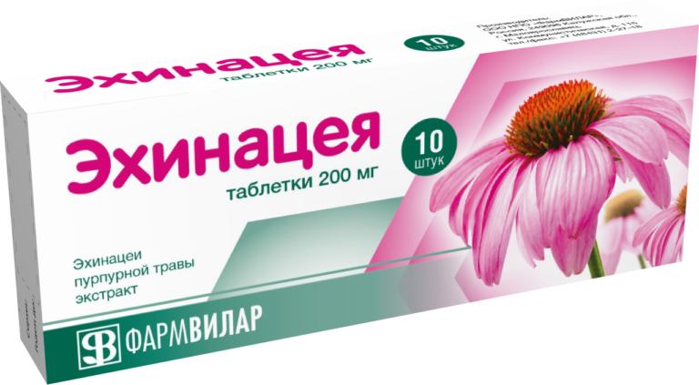 Действующее вещество: Эхинацеи экстракт сухой (с содержанием суммы производных оксикоричных кислот в пересчете на цикориевую кислоту 7 %) 200,0 мг;