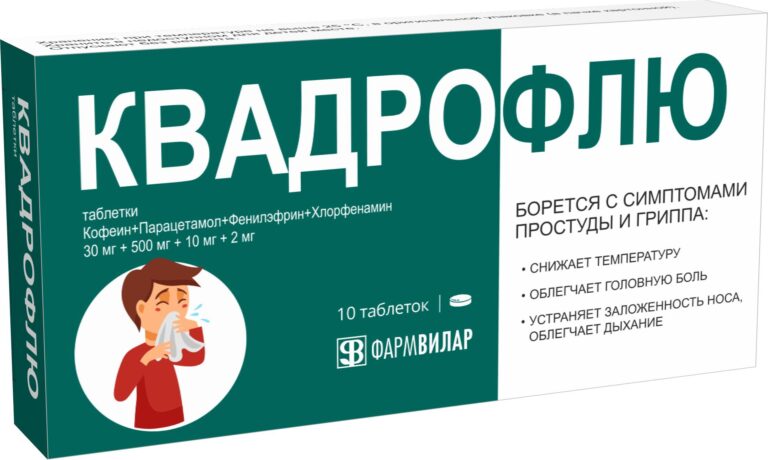 Лекарственный препарат КВАДРОФЛЮ® показан к применению у взрослых и подростков в возрасте от 15 лет для симптоматического лечения инфекционно-воспалительных заболеваний: ОРВИ, в том числе гриппа и «простуды», которые сопровождаются лихорадочным синдромом, головной болью, болью и ломотой в мышцах, ринореей, болью в горле, чиханием и другими симптомами.