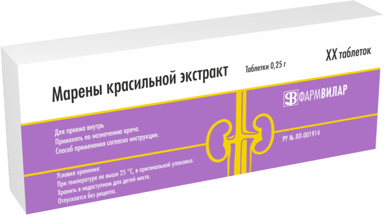 Действующее вещество: Марены красильной экстракт сухой (Марены корневищ и корней экстракт) (с содержанием суммы антрагликозидов в пересчете на руберитриновую кислоту и сухое вещество не менее 8 %) – 0,25 г.