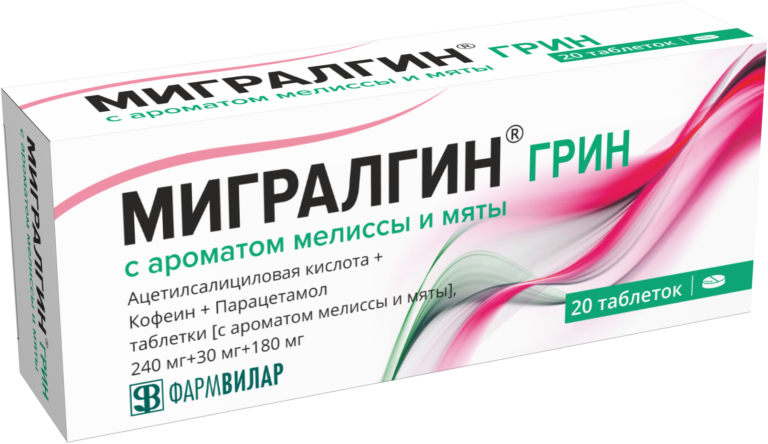 МИГРАЛГИН® ГРИН показан взрослым и детям с 15 лет при болевом синдроме и взрослым в возрасте от 18 лет при лихорадочном синдроме. Болевой синдром слабой и умеренной выраженности (различного генеза): головная боль, мигрень, зубная боль, невралгия, миалгия, артралгия, альгодисменорея. Лихорадочный синдром: при острых респираторных заболеваниях, в том числе при гриппе.